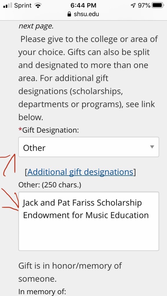 “Jack and Pat Fariss Scholarship Endowment for Music Education” Donation mail-in form: shsu-farissdonationform2020-2.pdf